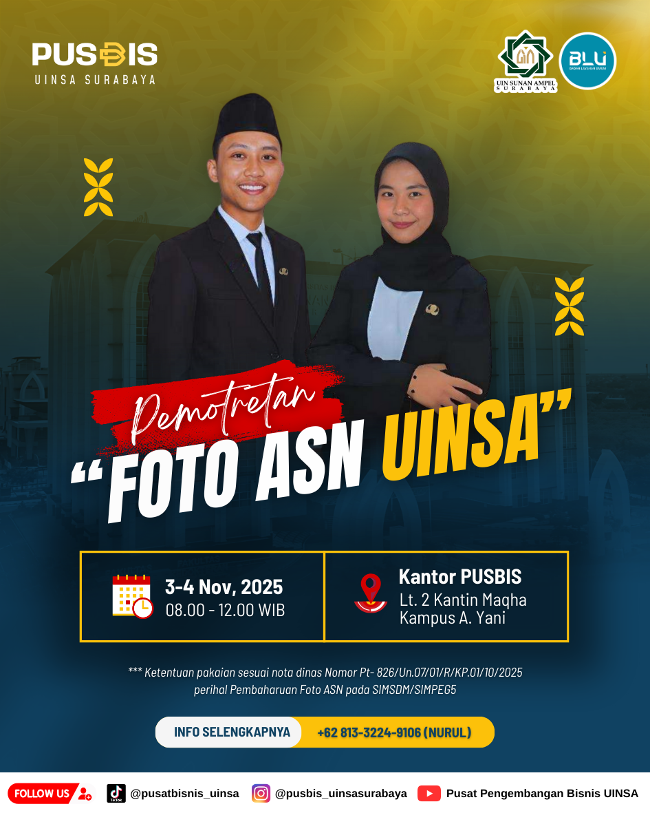Berdasarkan Nota Dinas Nomor: Pt-826/Un.07/01/R/KP.01/10/2025 perihal Pembaharuan Foto ASN pada SIMSDM/SIMPEG5, Pusat Pengembangan Bisnis (PUSBIS) UINSA membuka layanan pemotretan foto ASN UINSA yang akan dilaksanakan pada: