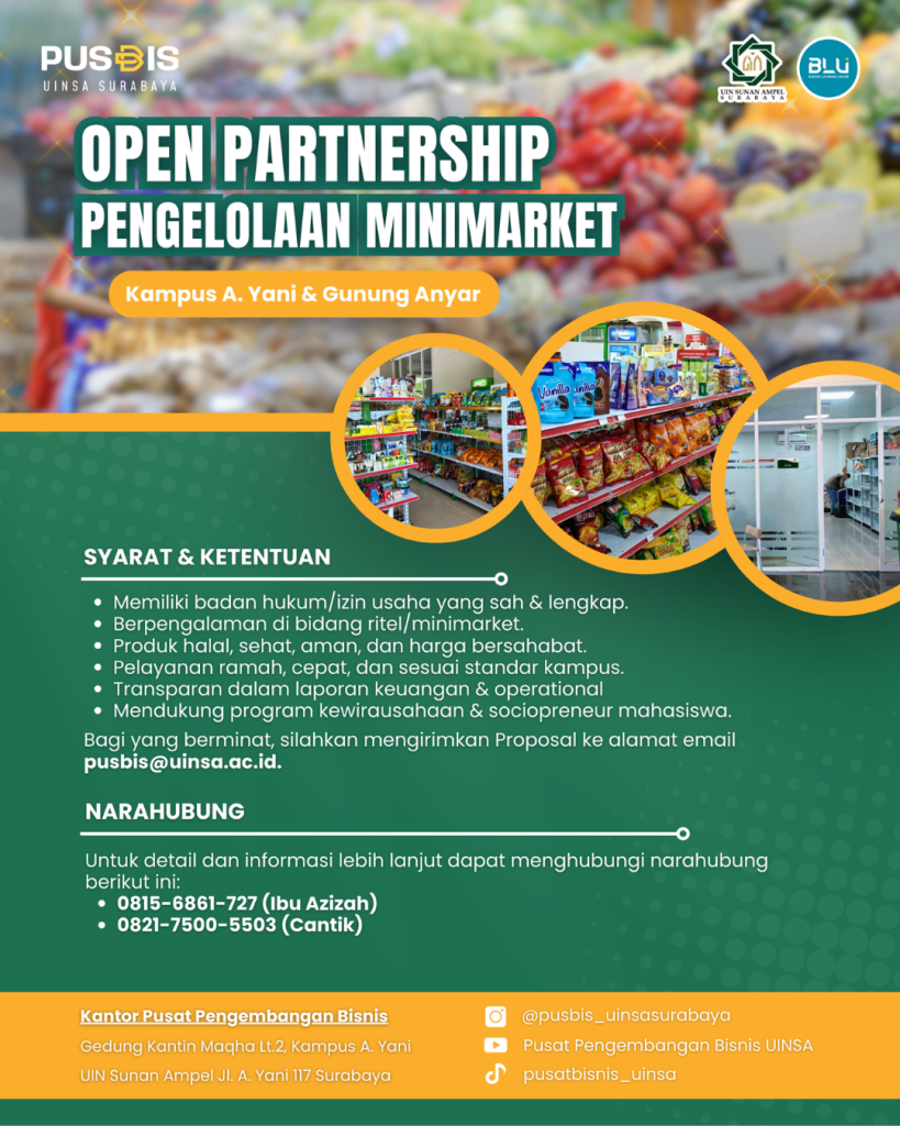 Pusat Pengembangan Bisnis UIN Sunan Ampel Surabaya kembali membuka peluang kerjasama strategis dalam pengelolaan minimarket di Kampus Ahmad Yani & Gunung Anyar.
