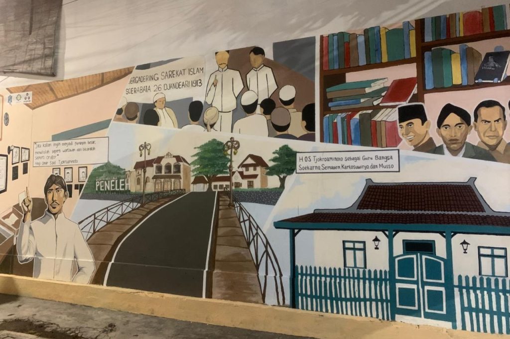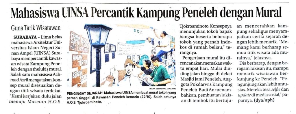Kegiatan Peningkatan Kualitas Ruang Publik Kampung Heritage Peneleh Surabaya merupakan bentuk nyata “pembelajaran berdampak” di mana mahasiswa tidak hanya belajar teori desain dan perencanaan, tetapi juga menerapkannya langsung untuk memberikan manfaat sosial bagi masyarakat. Selama 4 hari yaitu tanggal 18-21 Oktober 2025 diimplementasikan salah satu rekomendasi desain kegiatan Summer School untuk menghidupkan ruang dengan mural dining bertema “Sejarah Perjuangan HOS Cokrominoto” pada Jalan Peneleh VII. Melalui kegiatan ini, mahasiswa belajar memahami konteks sosial, budaya, dan lingkungan secara utuh. Hasilnya bukan hanya desain visual, tetapi juga solusi nyata yang dapat memperkuat karakter dan keberlanjutan kawasan heritage Kampung Peneleh Surabaya. Kegiatan ini melibatkan dosen dan mahasiswa Arsitektur UIN Sunan Ampel Surabaya, kelompok sadar wisata (Pokdarwis), dan pemerintah setempat serta masyarakat.