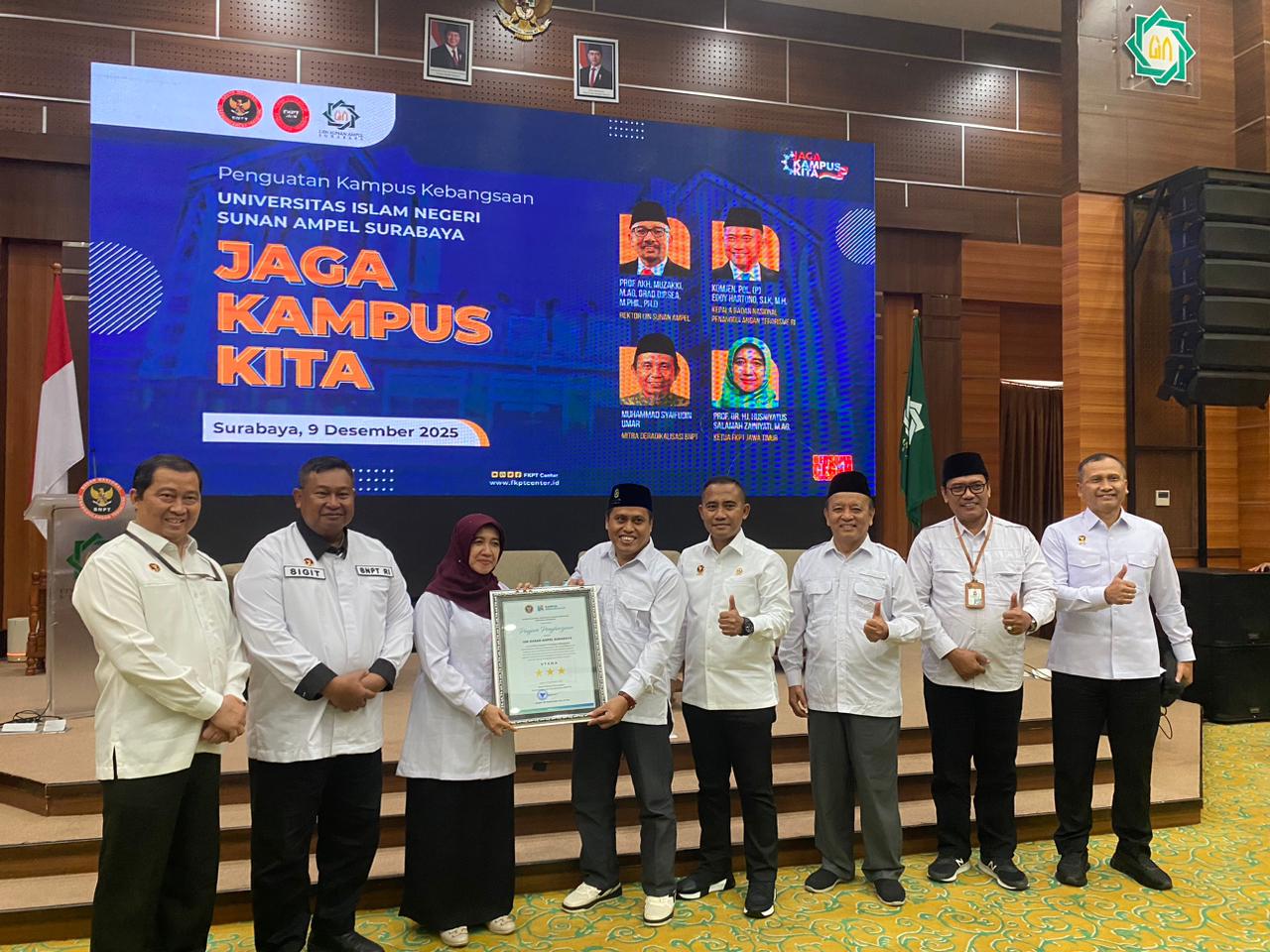 Magister Pendidikan Agama Islam-Badan Nasional Penanggulangan Terorisme (BNPT) RI bekerja sama dengan Forum Koordinasi Pencegahan Terorisme (FKPT) Jawa Timur memberikan anugerah Kampus Kebangsaan kepasa Universitas Islam Negeri Sunan Ampel (UINSA) Surabaya, (9/12/2025). Agenda bertajuk “Jaga Kampus Kita” ini diikuti 220 peserta dari unsur mahasiswa, dosen, mitra deradikalisasi, organisasi kepemudaan, dan tokoh lintas agama.