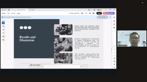 The first presentation examined how disaster management in Indonesia is deeply linked to the concept of human security. Presenters highlighted that NGOs from national groups like human initiative to partnerships such as MDRC working with the catholic relief service have repeatedly demonstrated rapid response capability and community protection in crisis. Referencing Law No. 24/2007 on disaster management, speaker emphasized that legal frameworks provide foundation for action, but it is the civil society actors who often deliver timely humanitarian support on the ground. BNPB data showing roughly 3,489 disaster events nationwide was used to underline the scale and urgency of the challenge.