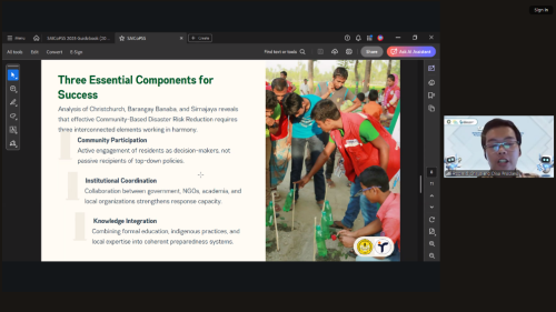 Across the four presentations, three core components of successful disaster resilience emerged: community participation, institutional coordination, and knowledge integration. Presenters referenced scholarship and practice (including work by scholars such as David Lewis and Nazneen Kanji) in pointing out the multiple roles NGOs play delivering humanitarian assistance, advocating for community needs, and bridging local knowledge with policy. The session concluded with a set of practical recommendations that can be acted on immediately: