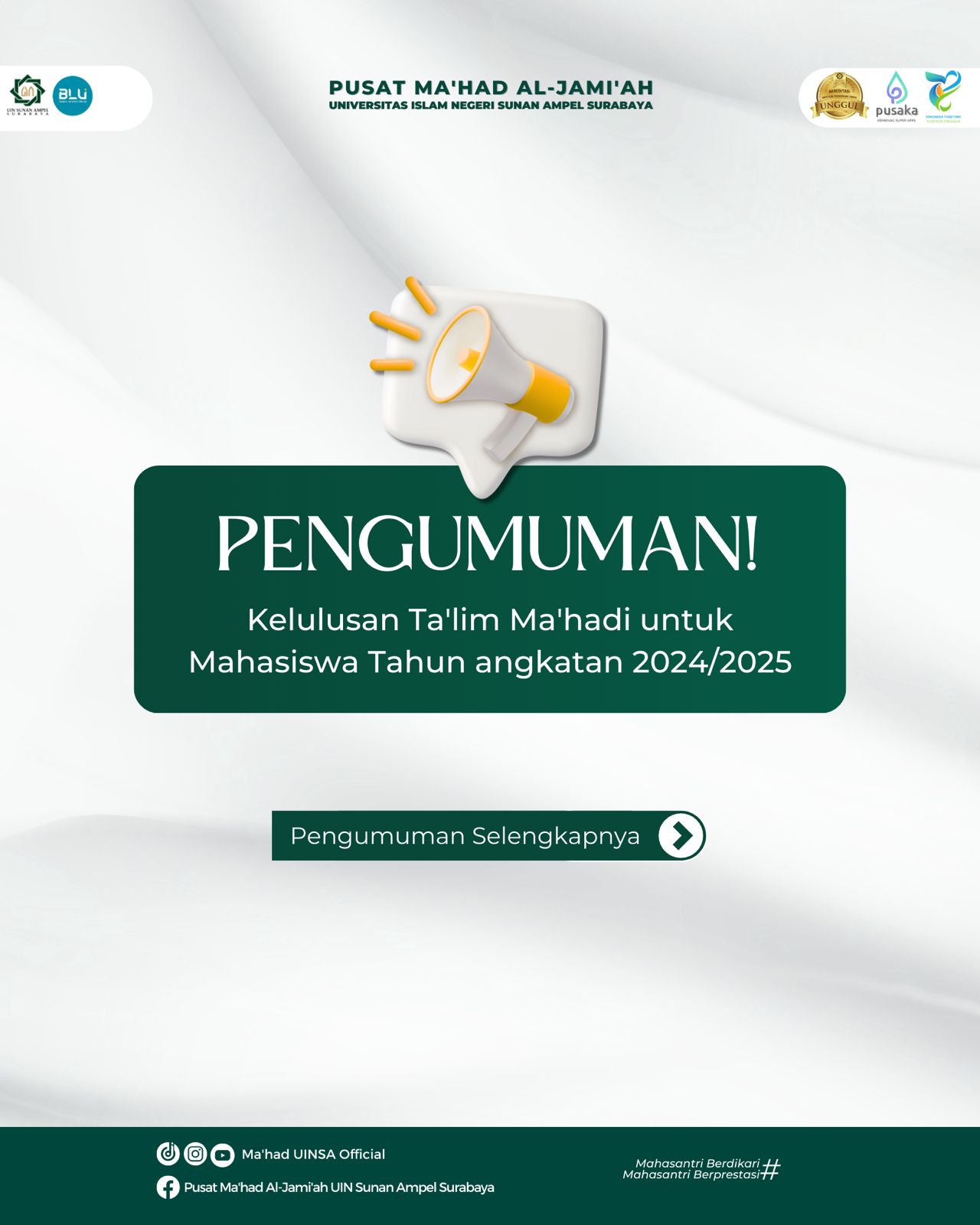 Assalamu’alaikum Wr. Wb. Diinformasikan kepada Mahasiswa UIN Sunan Ampel Surabaya Tahun Angkatan 2024/2025, tentang kelulusan Ta’lim Ma’hadi beberapa hal penting sebagai berikut: Kelulusan Ta’lim Ma’hadi ditentukan berdasarkan: Kehadiran minimal 75% pada tiap semester; Nilai minimal yang harus dicapai Mahasiswa adalah  71 (tujuh puluh satu) atau predikat “B-” dengan materi Hadits