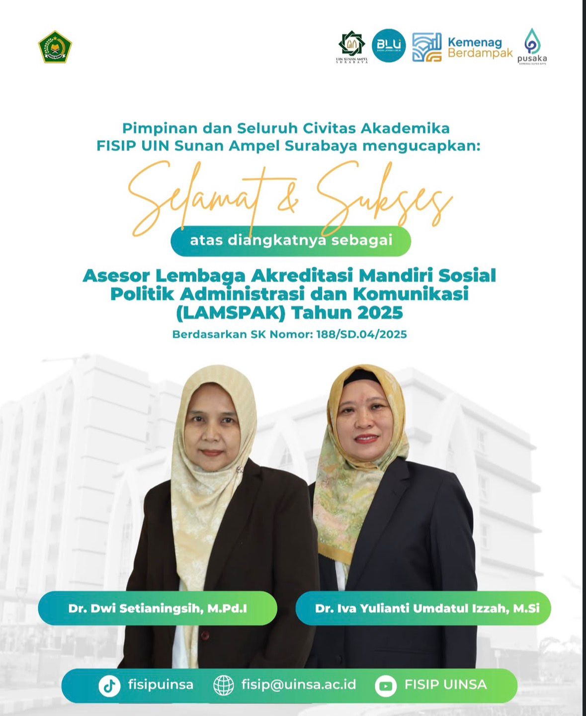 SURABAYA – Kiprah akademisi Fakultas Ilmu Sosial dan Ilmu Politik (FISIP) UIN Sunan Ampel (UINSA) Surabaya dalam penjaminan mutu pendidikan tinggi kembali mendapat pengakuan. Dua dosen sekaligus pimpinan fakultas, Dr. Iva Yulianti Umdatul Izzah, S. Sos, M.Si., dan Dr. Dwi Setianingsih, M.Pd.I. resmi dinyatakan lolos seleksi sebagai asesor Lembaga Akreditasi Mandiri Sosial, Politik, Administrasi, dan Komunikasi (LAMSPAK). Capaian ini menjadi salah satu bukti partisipasi aktif FISIP UINSA dalam mendukung tata kelola standar akademik di tingkat nasional, sekaligus memperluas jejaring institusi dengan berbagai perguruan tinggi di Indonesia.