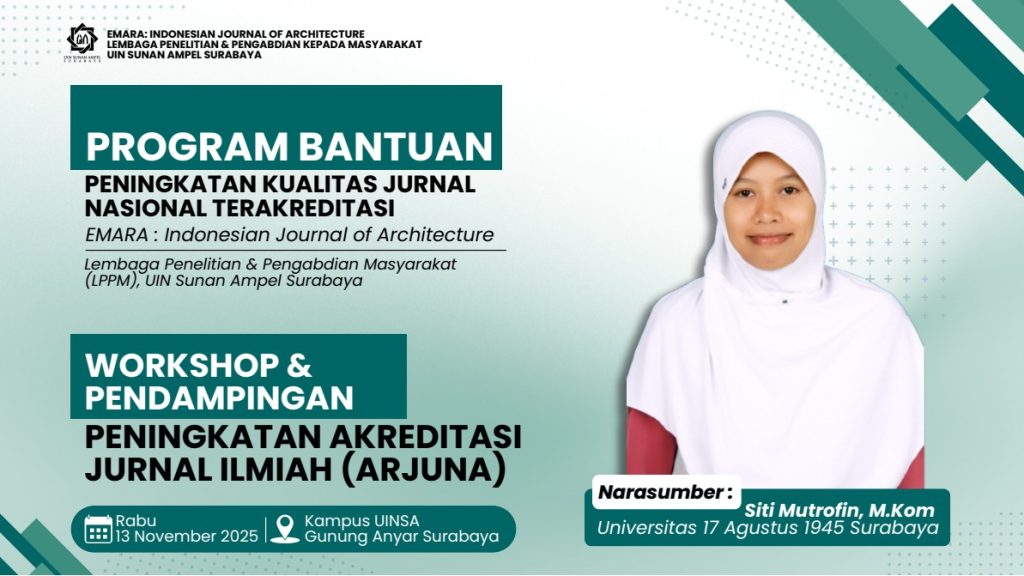 Surabaya – Dalam upaya berkelanjutan meningkatkan mutu perguruan tinggi, publikasi ilmiah merupakan tolok ukur fundamental yang mencerminkan reputasi akademik dan kontribusi kampus dalam pengembangan ilmu pengetahuan. Menanggapi urgensi ini, EMARA Indonesian Journal of Architecture UIN Sunan Ampel (UINSA) Surabaya menyelenggarakan Workshop dan Pendampingan Pengelolaan Jurnal Ilmiah. Kegiatan strategis ini merupakan bagian dari program bantuan “Peningkatan Kualitas Jurnal Nasional Terakreditasi” yang didukung penuh oleh Lembaga Penelitian dan Pengabdian kepada Masyarakat (LP2M) UINSA. Program ini dirancang untuk memperkuat manajemen pengelolaan jurnal agar lebih efektif, sekaligus menjadi solusi atas tantangan umum yang kerap dihadapi pengelola, seperti standar editorial yang belum optimal, kualitas naskah yang inkonsisten, hingga kurangnya pemahaman mendalam terhadap instrumen akreditasi terbaru.