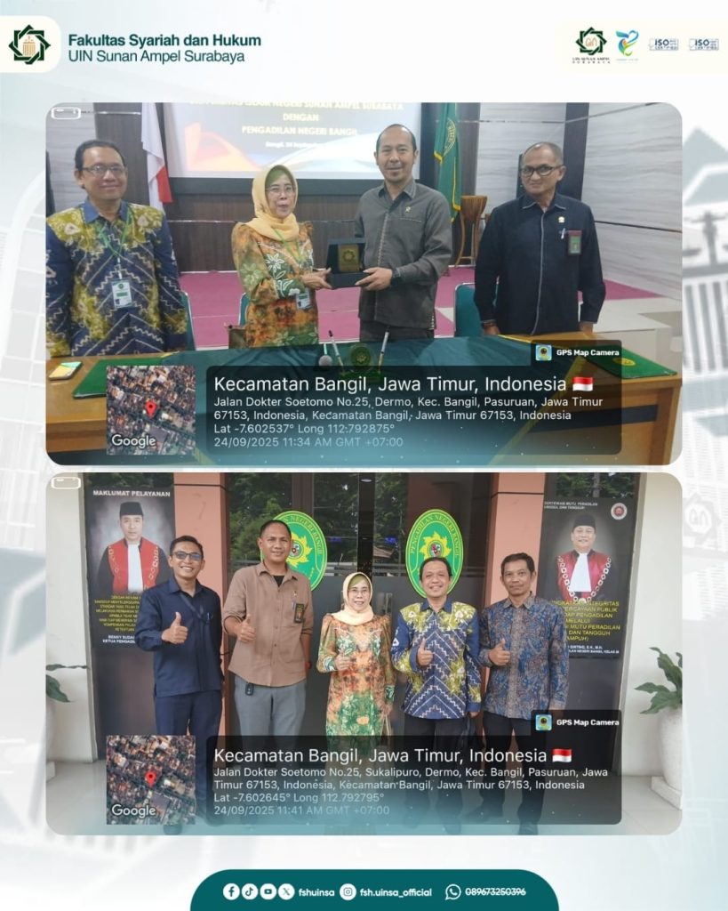 Bangil, 24 September 2025 – Fakultas Syariah dan Hukum (FSH) UIN Sunan Ampel Surabaya terus memperkuat ekosistem pendidikan hukum melalui penandatanganan nota kesepahaman (MoU) dengan Pengadilan Negeri (PN) Bangil, Rabu (24/9/2025), di Ruang Sidang Utama PN Bangil. Inisiatif strategis ini bertujuan untuk mengintegrasikan dimensi teoritis dan praktis pendidikan hukum, sehingga mahasiswa tidak hanya menguasai pengetahuan akademik, tetapi juga memahami implementasi hukum secara nyata dalam sistem peradilan. Langkah ini diharapkan memperluas ruang belajar di luar kampus sekaligus memperkuat konektivitas antara lembaga pendidikan tinggi Islam dan institusi peradilan umum.
