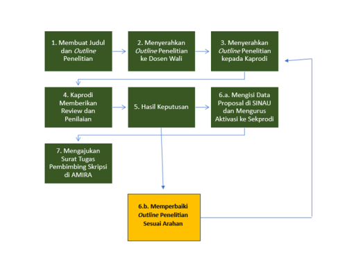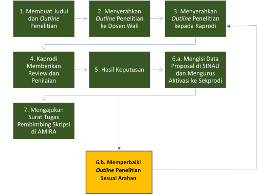 | 3. Menyerahkan Outline Penelitian kepada Kaprodi | Setelah mendapat persetujuan dari dosen wali, mahasiswa menyerahkan outline penelitian skripsi kepada Kaprodi. |