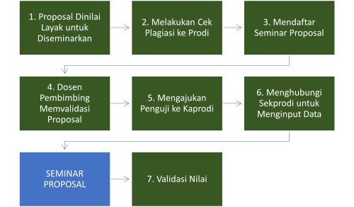 | 6. Menghubungi Sekprodi | Setelah mendapatkan kepastian penguji, mahasiswa menghubungi Sekprodi. Sekprodi akan menginput jadwal seminar proposal dan penguji di data proposal tugas akhir mahasiswa. |