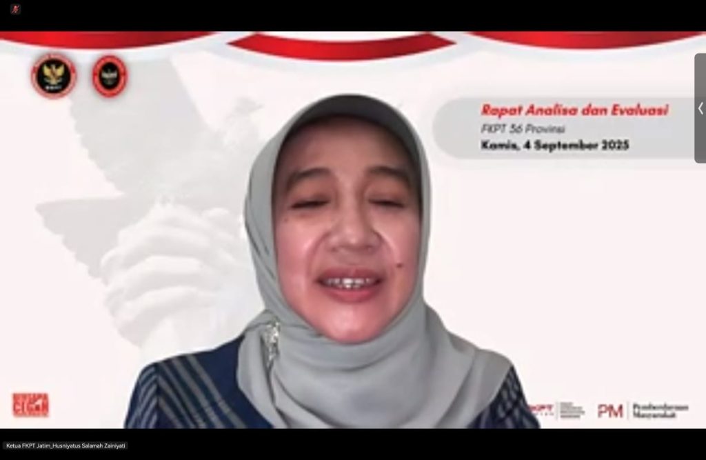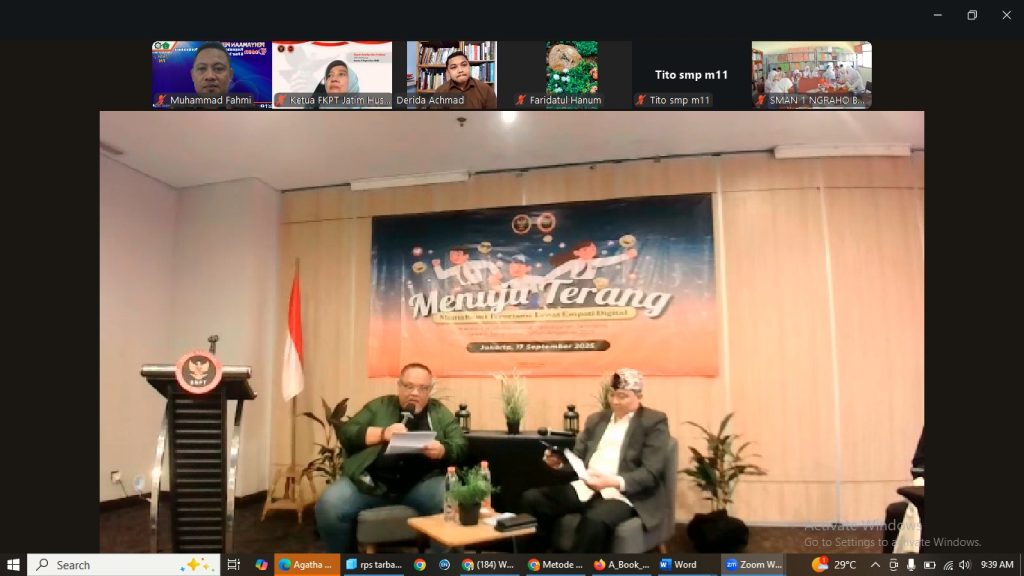 Dalam kegiatan “Menuju Terang: Memahami Terorisme Lewat Empati Digital” yang digelar secara daring melalui aplikasi Zoom oleh Badan Nasional Penanggulangan Terorisme (BNPT) Republik Indonesia bersama Forum Koordinasi Pencegahan Terorisme (FKPT) Jawa Timur pada Rabu, 17 September 2025, telah menghadirkan narasumber dari dosen FTK UINSA yang sekaligus Ketua FKPT Jawa Timur, Prof. Dr. Husniyatus Salamah Zainiyati, M.Ag., serta Dr. Kol. (Sus) Harianto, M.Pd., Kabid Pemberdayaan Masyarakat BNPT, dan Ahmad Derrida, Kapus Pemuda Moderasi Beragama UNESA.