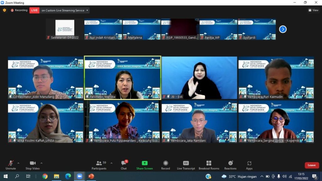 Indonesia Development Forum 2022 merupakan ajang tahunan yang dilaksanakan untuk menampung berbagai ide-ide kreatif dan inovatif dari keresahan masyarakat dalam rangka mendukung pembangunan Indonesia. Dengan membawa semangat Inspire, Imagine, Innovate, and Initiate harapannya dari karya-karya IDF tersebut dapat diaplikasikan menjadi usulan kebijakan pembangunan selanjutnya. Rangkaian kegiatan dimulai dari sesi penyampaian presentasi oleh para narasumber, dilanjutkan sesi pemberian tanggapan oleh pihak Bappenas RI dan sesi diskusi tanya jawab, serta harapan ke depan dari seluruh partisipan yang terlibat.