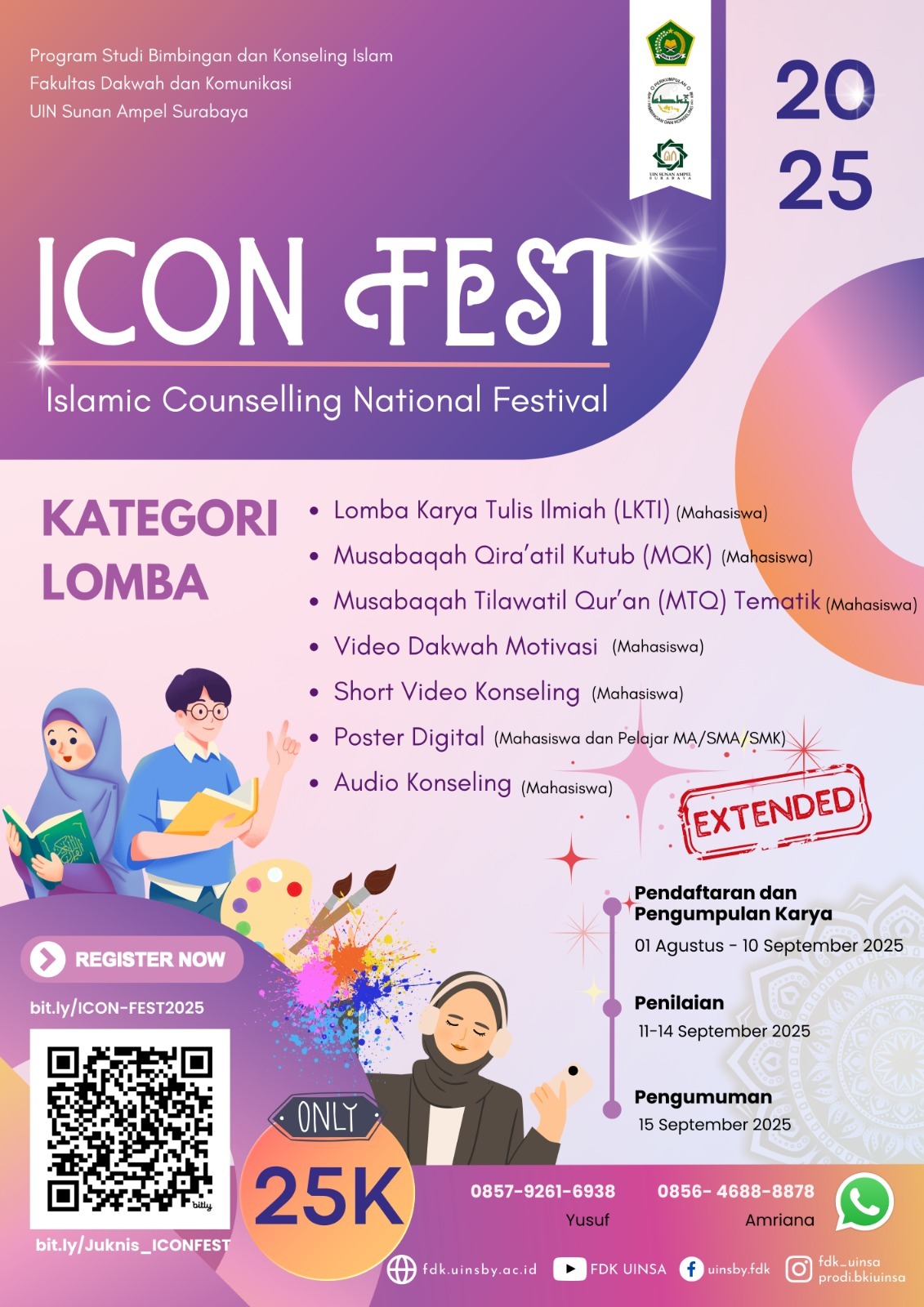 Surabaya, 15 September 2025 — ICON FEST 2025 telah selesai dilaksanakan dengan lancar. Panitia mengucapkan terima kasih kepada seluruh peserta yang telah mendaftar dan ikut berpartisipasi. Tahun ini ICON FEST menghadirkan 7 cabang lomba dengan total 105 peserta. Dari seluruh rangkaian perlombaan, terpilih 27 pemenang yang berhasil meraih juara. Daftar lengkap pemenang bisa dilihat melalui akun Instagram Prodi BKI UINSA (@bki.uinsa) atau melalui artikel ini.