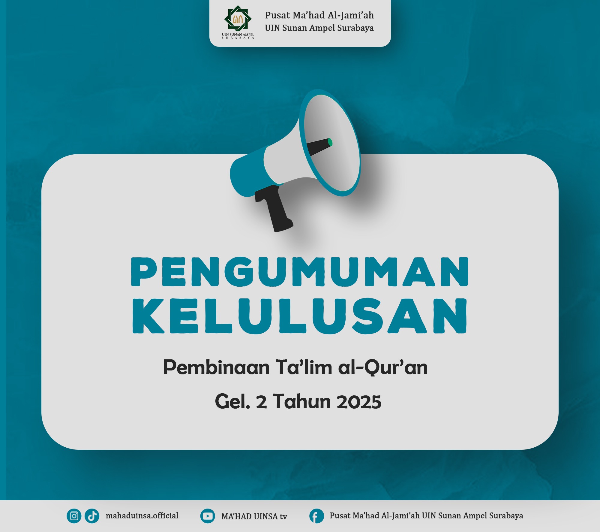 Diinformasikan kepada mahasiswa UIN Sunan Ampel Surabaya yang telah mengikuti Pembinaan Ta’lim Al-Qur’an Gelombang 2 Tahun 2025 beberapa hal penting berikut ini :