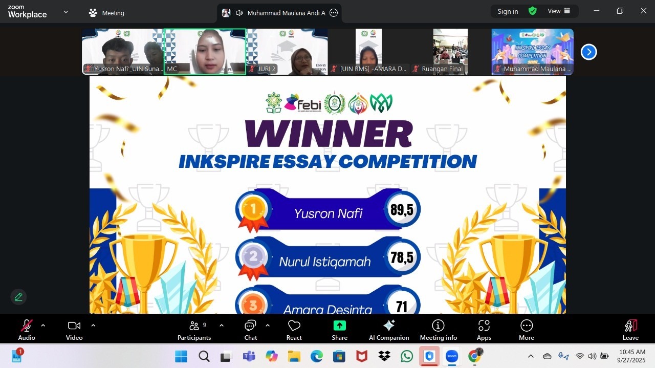 UINSA Newsroom, Senin (29/09/2025); Sabtu pagi, 27 September 2025, suasana di layar Zoom mendadak riuh. Terdengar tepuk tangan virtual dan sorak gembira ketika nama Yusron Nafi’ Putra Daeva, mahasiswa Fakultas Ekonomi dan Bisnis Islam (FEBI) UIN Sunan Ampel (UINSA) Surabaya, diumumkan sebagai Juara 1 INKSPIRE Essay Competition (INESCO) 2025 yang digelar UIN Raden Mas Said Surakarta. Nilai yang diraihnya, 89,5 poin, menjadi yang tertinggi, mengungguli puluhan peserta dari berbagai perguruan tinggi di Indonesia.