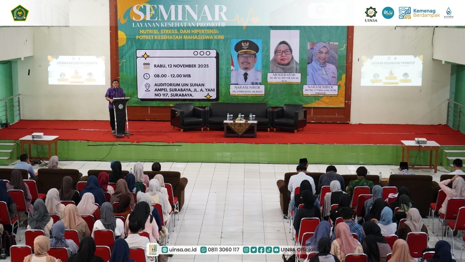 UINSA Newsroom, Rabu (12/11/2025); Klinik Pratama Universitas Islam Negeri Sunan Ampel (UINSA) Surabaya menunjukkan komitmennya dalam layanan kesehatan preventif dan promotif dengan menggelar seminar kesehatan bertajuk “Nutrisi, Stres, dan Hipertensi: Potret Kesehatan Mahasiswa Masa Kini” pada Rabu (12/11/2025). Acara yang dilaksanakan di Ruang Auditorium Kampus A. Yani UINSA Surabaya ini bertujuan meningkatkan kesadaran akan pentingnya menjaga kesehatan fisik dan mental di kalangan mahasiswa, mengingat tantangan akademik dan gaya hidup saat ini.
