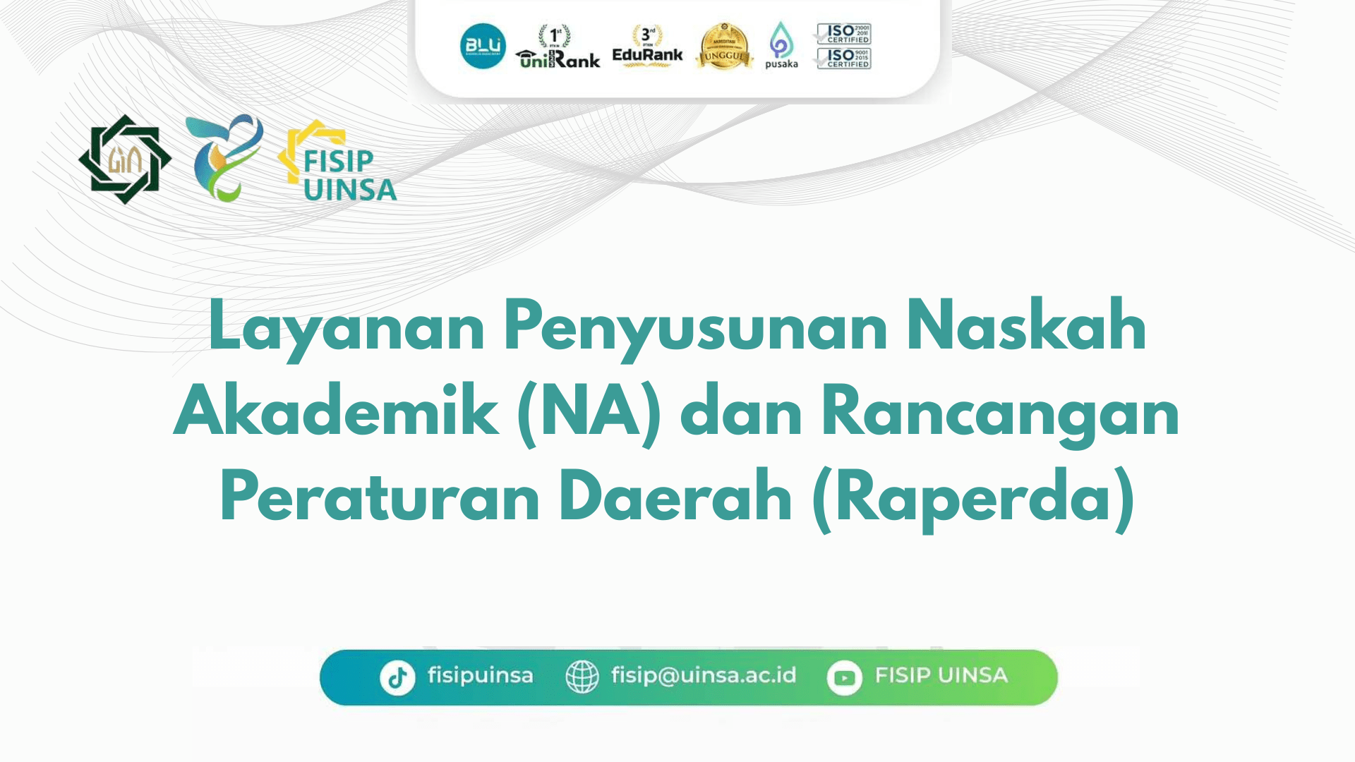 Dengan rekam jejak yang terbukti dan didukung oleh para akademisi yang memiliki keahlian spesifik dalam tata kelola pemerintahan, hukum, dan analisis sosial, FISIP UINSA menawarkan lebih dari sekadar layanan teknis penyusunan dokumen. Kami menawarkan kemitraan intelektual untuk menghasilkan peraturan daerah yang tidak hanya sah secara hukum, tetapi juga efektif, berkeadilan, dan benar-benar menjawab kebutuhan masyarakat. Percayakan penyusunan fondasi hukum daerah Anda kepada FISIP UINSA untuk pembangunan yang terarah dan berkelanjutan. Hubungi Whatsapp ……. (FISIP UINSA)