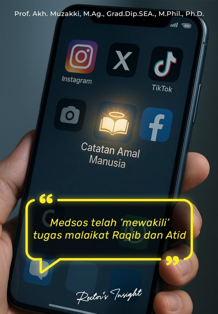 Mengapa perlu begitu? Sederhana sekali penjelasannya. Kerja pencatatan dan pengawasan malaikat raqib dan atid sudah diturunkan kepada platform digital. Medsos adalah satu satu di antara yang utama. Tentu tak semua dapat menghadirkan Tuhan dalam setiap langkahnya di dunia material. Tentu tak setiap diri memiliki kecakapan untuk menghadirkan Allah SWT dalam berpikir dan bertindaknya di kehidupan duniawi. Tapi, ada yang bisa dilakukan sebagai langkah awal nan sederhana: yakinlah bahwa Allah telah menurunkan makhluqnya yang bernama medsos sebagai “utusan” yang membantu kerja pencatatan dan pengawasan yang selama ini ditugaskan kepada malaikat raqib dan atid.