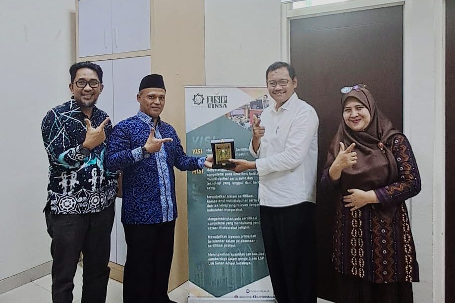 Turut menjamu kegiatan benchmarking ini Warek I Prof. Dr. H. Ali Mudlofir, MAg, Ketua LPM Dr. Ali Mustofa, MPd, Ketua LSP Dr. Yusuf Amrozi, M.MT, Manajer Sertifikasi LSP Subhan Nooriansyah, M.Kom dan Ketua Komite Skema LSP UINSA Soffy Balgies, MPSi. Dalam sambutannya Prof. Ali Mudlofir menekankan pentingnya keberadaan LSP di perguruan tinggi untuk memastikan lulusan perguruan tinggi kompeten sehingga mudah terserap di lapangan pekerjaan.