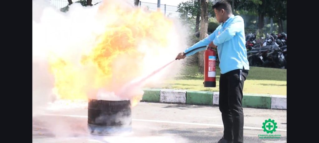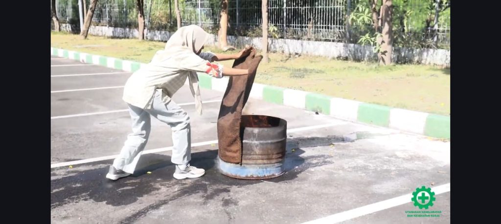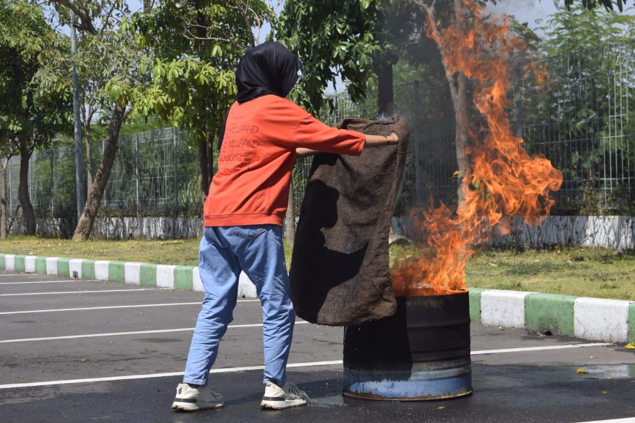 Mahasiswa dilatih memadamkan api kecil dengan metode sederhana menggunakan karung goni basah untuk mencegah api menyebar sebelum kondisi menjadi berbahaya - Pemadaman api menggunakan APAR (Alat Pemadam Api Ringan)