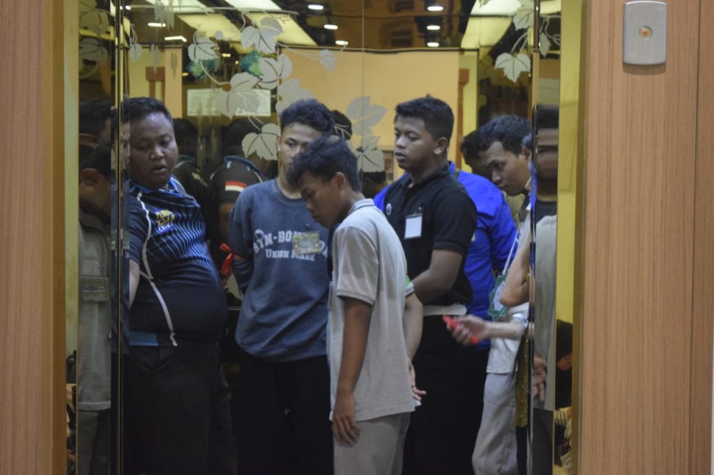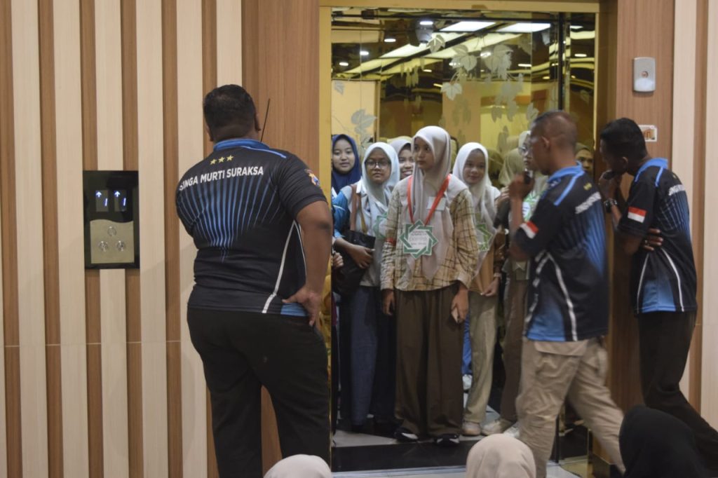 Peserta mendapatkan edukasi tentang langkah aman saat lift berhenti mendadak, seperti tetap tenang, menekan tombol darurat, dan menunggu bantuan teknisi tanpa memaksa membuka pintu lift. - Simulasi Gempa Bumi