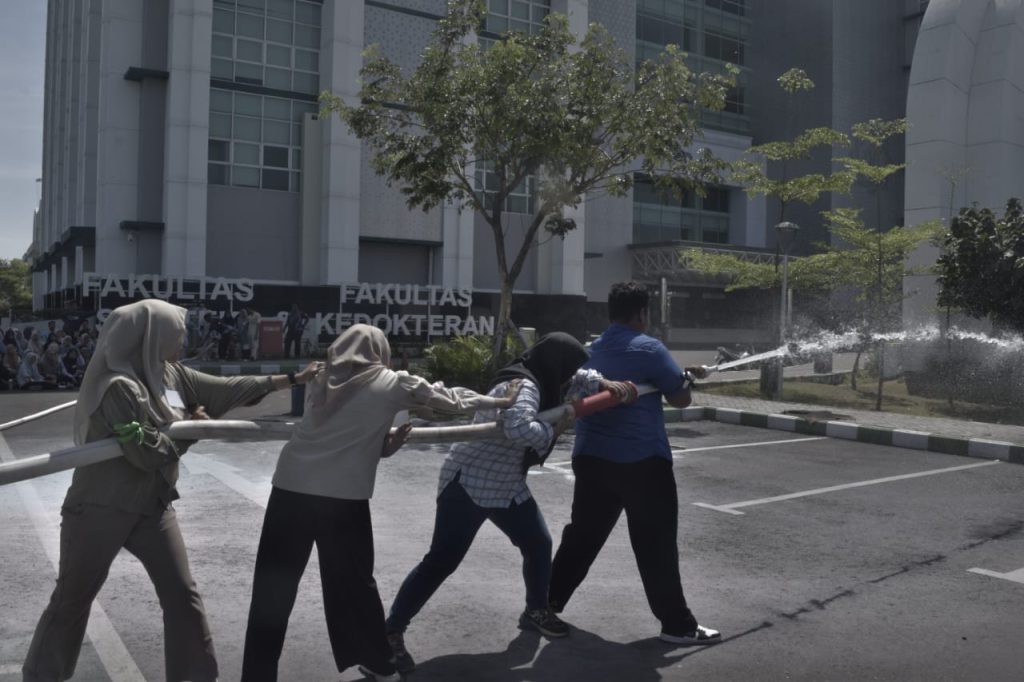 Mahasiswa dilatih untuk tetap waspada dan memahami prosedur evakuasi saat terjadi gempa, mulai dari posisi perlindungan diri hingga berpindah ke area aman.