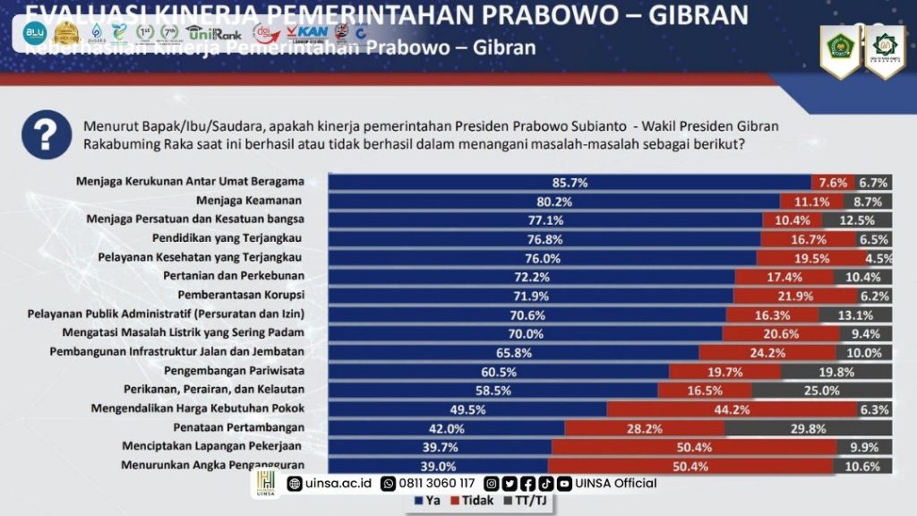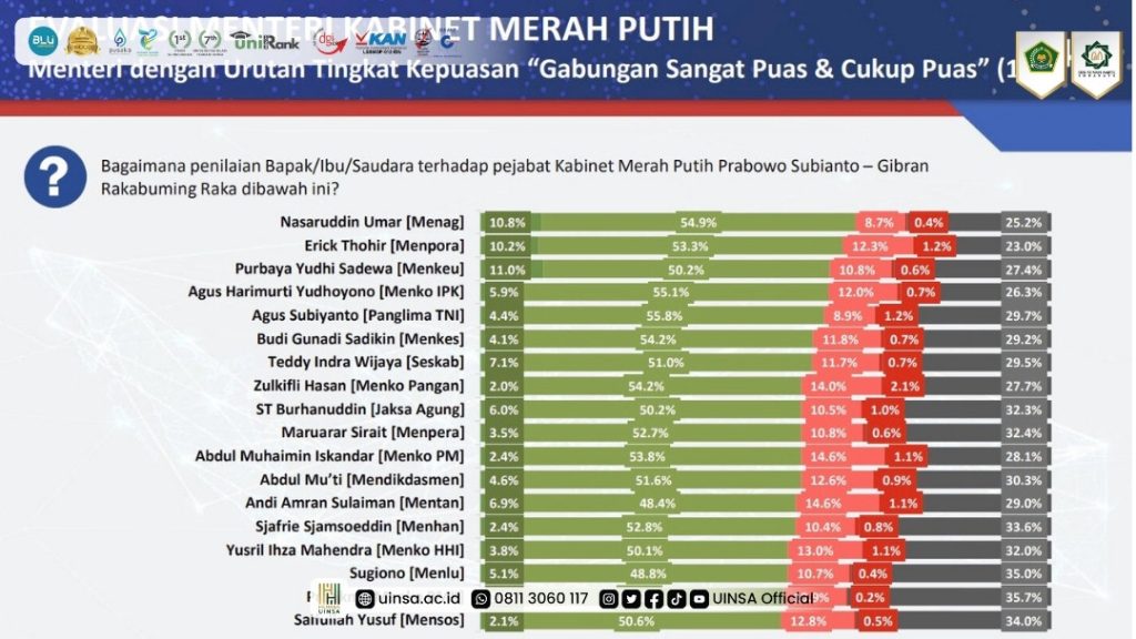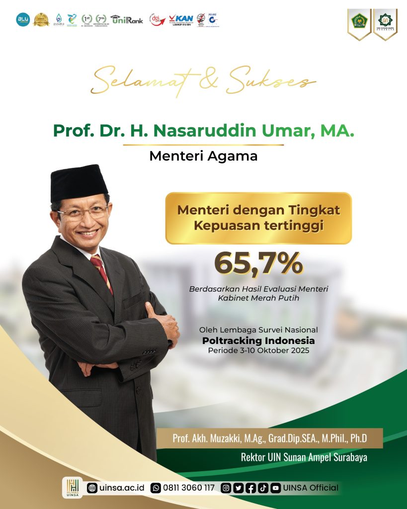 UINSA Newsroom, Senin (20/10/2025); Menteri Agama RI, Prof. Dr. KH. Nasaruddin Umar, MA., mendapat apresiasi kinerja tertinggi dari publik berdasarkan survei Poltracking Indonesia, di antara 52 pejabat setingkat Menteri yang tergabung dalam Kabinet Merah Putih. Hasil survei dengan tema “Evaluasi Satu Tahun Kinerja Pemerintahan Prabowo-Gibran” tersebut dirilis pada Ahad, 19 Oktober 2025.