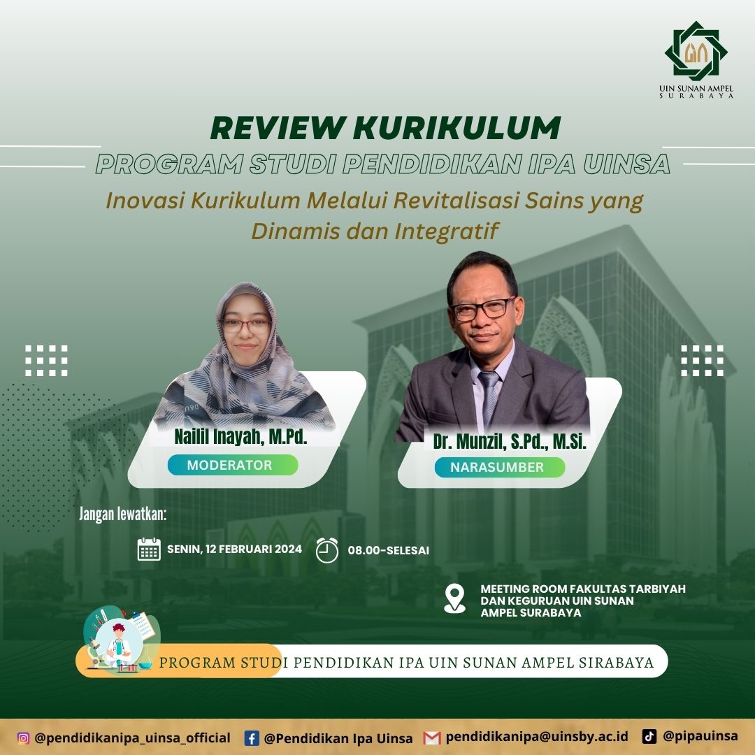 Senin, 12 Februari 2024, mulai pukul 08.00 hingga selesai di Meeting Room Fakultas Tarbiyah dan Keguruan (FTK) UIN Sunan Ampel Surabaya, Program Studi Pendidikan IPA Universitas Islam Negeri Sunan Ampel Surabaya menggelar kegiatan Review Kurikulum dengan mengusung tema “Inovasi Kurikulum Melalui Revitalisasi Sains yang Dinamis dan Integratif”. Kegiatan ini dihadiri oleh Dekan Fakultas Tarbiyah dan Keguruan, Wakil Dekan Bidang Akademik dan Kelembagaan, Wakil Dekan Bidang AUPK, Ketua dan wakil Jurusan Pendidikan Matematika dan IPA, Ketua dan Sekretaris, dosen serta mahasiswa semester 6 Prodi Pendidikan IPA. Turut hadir sebagai narasumber Dr. Munzil, S.Pd., M.Si., selaku ketua asosiasi Perkumpulan Pendidik IPA Indonesia (PPII) Jawa Timur.