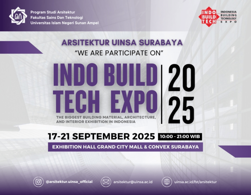 Program Studi Arsitektur UIN Sunan Ampel Surabaya (UINSA) berpartisipasi dalam Indo Build Tech Expo 2025, yang merupakan pameran konstruksi, arsitektur dan interior terbesar di Indonesia. Pameran dilaksanakan di Grand City Convex Surabaya mulai 17-21 September 2025. Partisipasi Prodi Arsitektur UINSA tidak hanya untuk menampilkan karya mahasiswa, tetapi juga sebagai langkah strategis dalam mempromosikan visi akademik sekaligus menjalin jejaring kolaborasi dengan berbagai pihak.