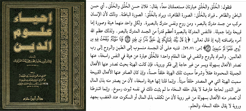 Mentalitas diri itulah yang disebut dengan, dan sekaligus menjadi wilayah garap, akhlaq. Dan akhlaq itu berada dalam area hulu. Hilirnya adalah perilaku, dan itu disebut dengan af’al. Al-Ghazali memang menyebut area hulu dengan istilah al-mashdar. Sebab, saat sudah terpateri kuat sebagaimana diilustrasikan oleh kata rasikhah, sebagaimana disebut di atas,maka ia segera menjadi hulu. Nah, hilirnya disebut dengan af’al atau perilaku. Di titik dan konteks inilah, al-Ghazali menempatkan posisi akhlaq dalam relasinya dengan istilah af’al itu. Apa yang keluar dalam ranah af’al adalah cerminan dari kondisi akhlaq. Gambar petikan halaman dari Kitab Ihya’ Ulumiddin Karya al-Ghazali di bawah ini sangat ilustratif.