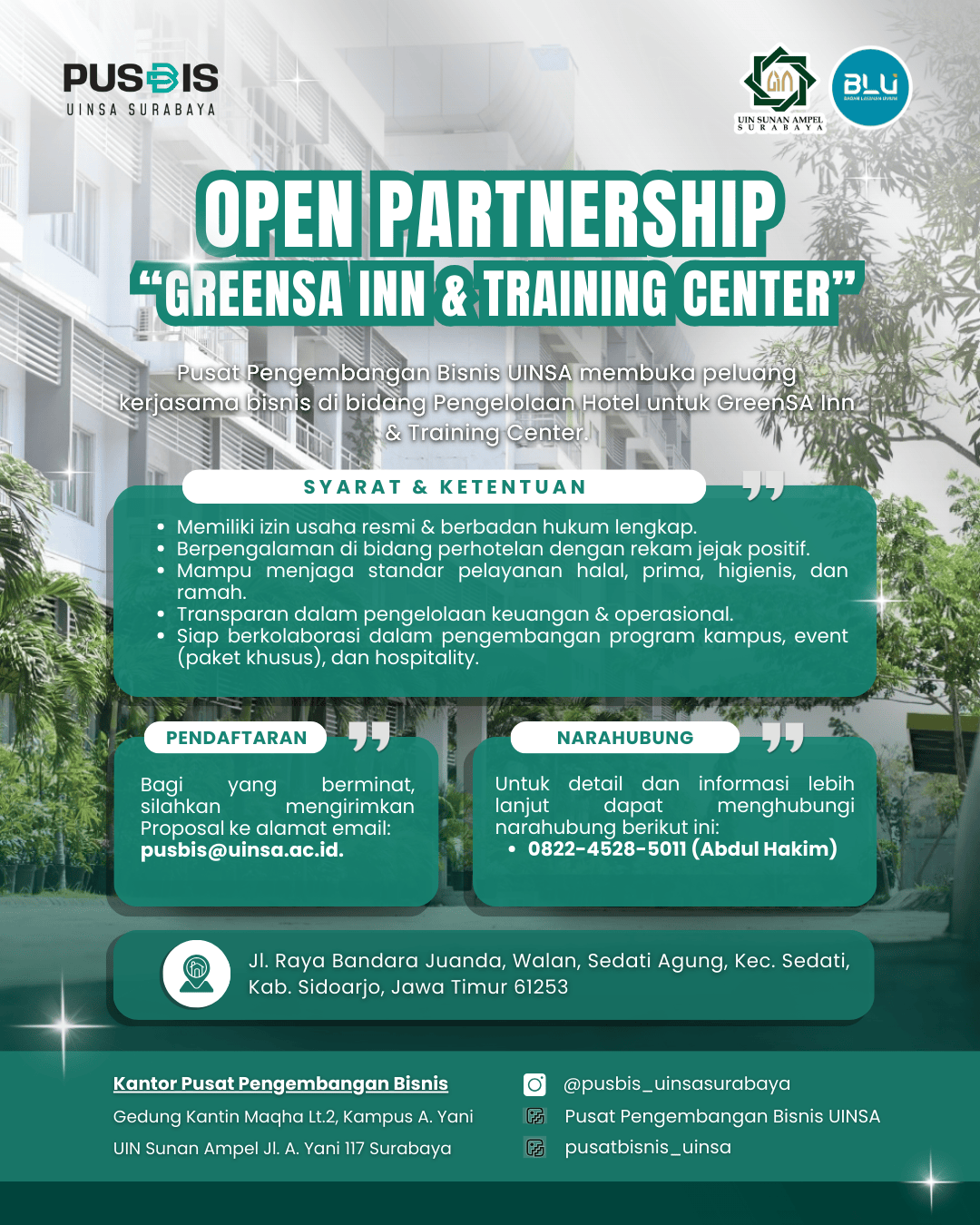 Pusat Pengembangan Bisnis (PUSBIS) UIN Sunan Ampel Surabaya membuka peluang kerjasama dalam pengelolaan Greensa Inn & Training Center. Kemitraan ini merupakan langkah strategis untuk menghadirkan standar hospitality yang profesional, islami, dan berdaya saing, sekaligus mendukung pengembangan ekonomi kampus.