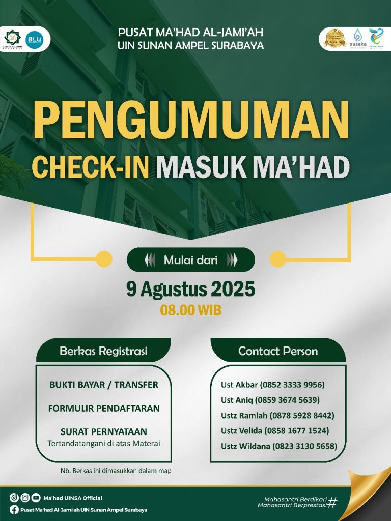 Diinformasikan kepada Mahasantri Baru dan Lama Putra dan Putri Mahad Al-Jamiah UIN Sunan Ampel Surabaya, yang sudah mendaftar dan menyelesaikan administrasi beberapa hal penting sebagai berikut.