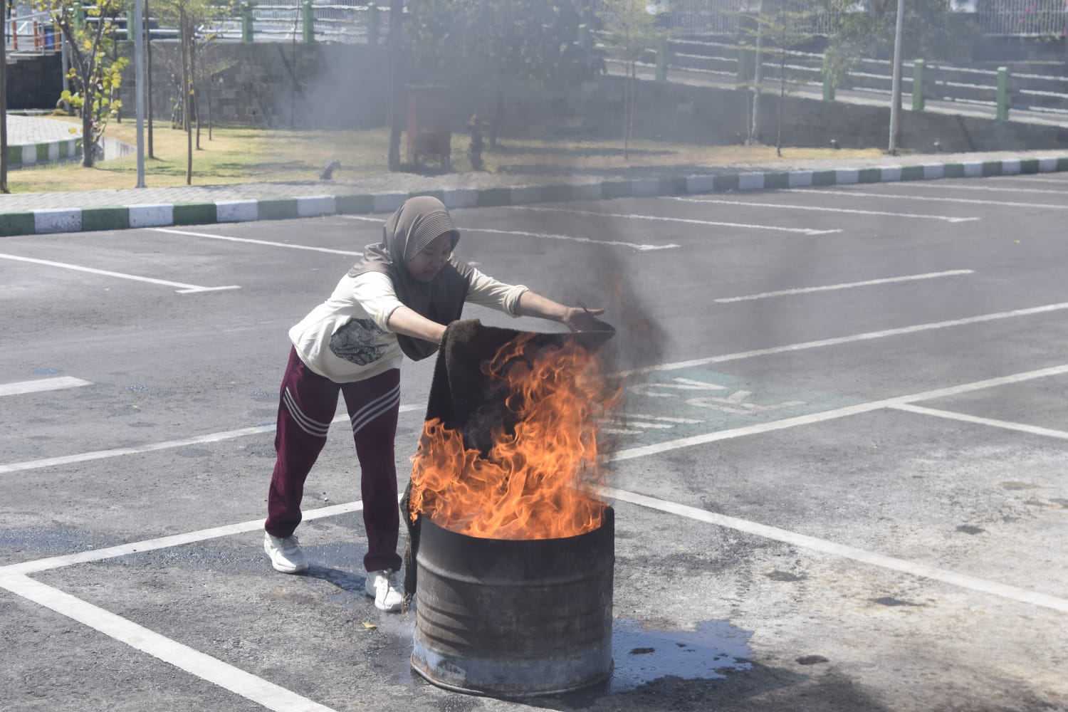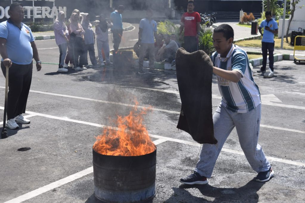 - Pemadaman api secara konvensional dengan karung goni, sebagai latihan penanganan awal kebakaran sederhana.