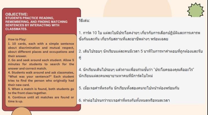 Proses pembelajaran berlangsung dinamis, setiap siswa-siswi kelas 12 mendapat satu kartu berisi pernyataan dan jawaban terkait diskriminasi dan kesetaraan, occupation and places. Tantangan diberikan dengan masing-masing siswa harus menemukan teman sekelas dengan kartu jawaban yang tepat, lalu mendiskusikannya secara lisan dalam bahasa Inggris. Salah satu contoh memory card yang digunakan berbunyi, “What is anti-discrimination law?” dengan kartu pasangannya dijawab, “A law that forbids unfair treatment based on religion, race, or gender.”