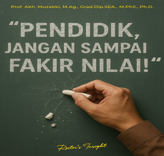 Karena pendidikan itu tentang value, maka siapapun yang sudah berada dalam panggung di atasnya tak sepatutnya kehabisan nilai. Apalagi lalu kehilangan nilai sama sekali. Sebab, bagaimana mungkin dan bisa menjadi produsen, atau minimal penyampai nilai, jika mereka yang terlibat dalam penyelenggaraan kegiatan pendidikan itu miskin nilai. Miskin saja tak boleh, apalagi tak punya sama sekali. Maka, apapun nama yang digunakan dan berlaku di tengah komunitasnya, pendidik jangan sampai mengalami kefakiran nilai. Fakir nilai ini tak selalu ada kaitannya dengan kualifikasi akademik. Bisa saja kualifikasi akademik tinggi, tapi fakir nilai tetap bisa mengancam tingginya kualifikasi akademik itu. Sebab, nilai dalam kaitan itu telah gagal mengiringi tingginya kualifikasi akademik yang disandangnya itu.