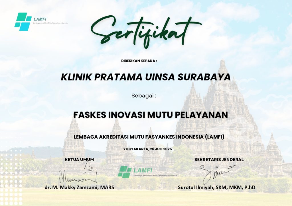 Klinik Pratama UINSA Surabaya mendapatkan penghargaan dari Lembaga Akreditas Mutu Fasyankes Indonesia (LAMFI) dalam ajang kompetisi faskes inovasi dengan Kategori “Inovasi Mutu Pelayanan”