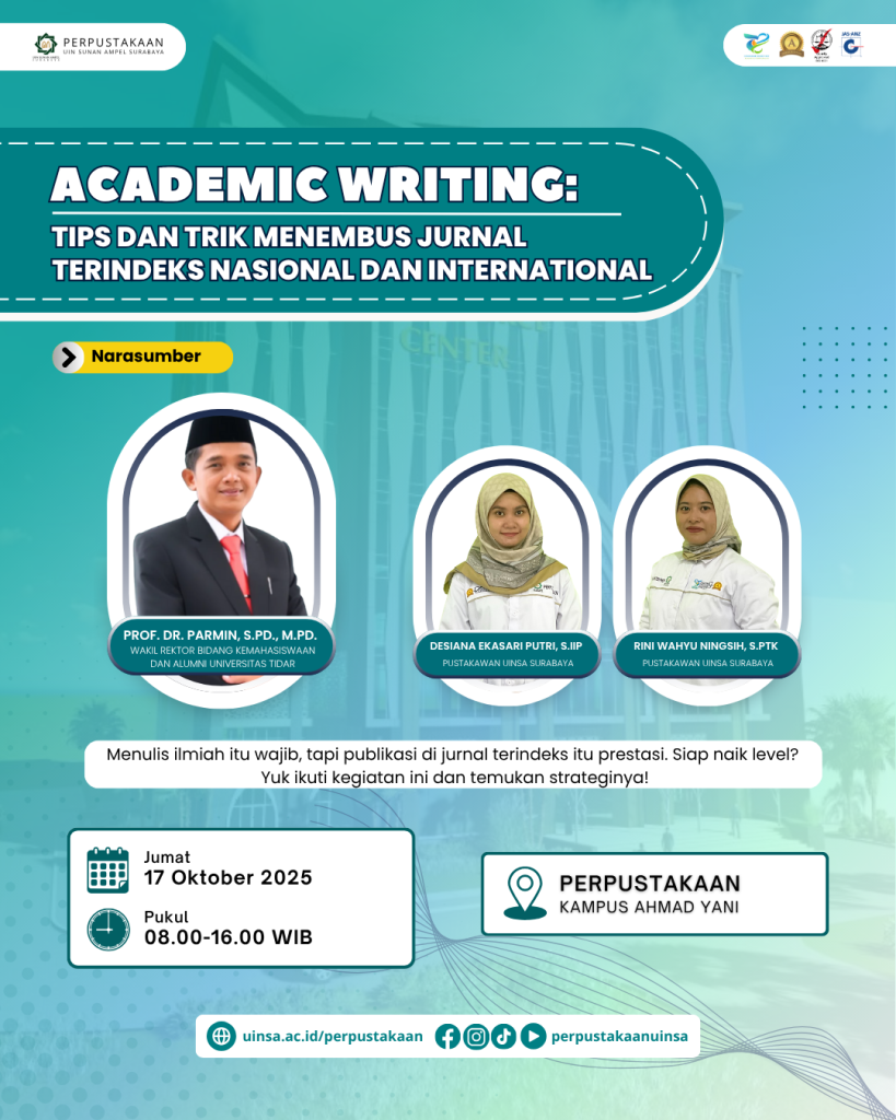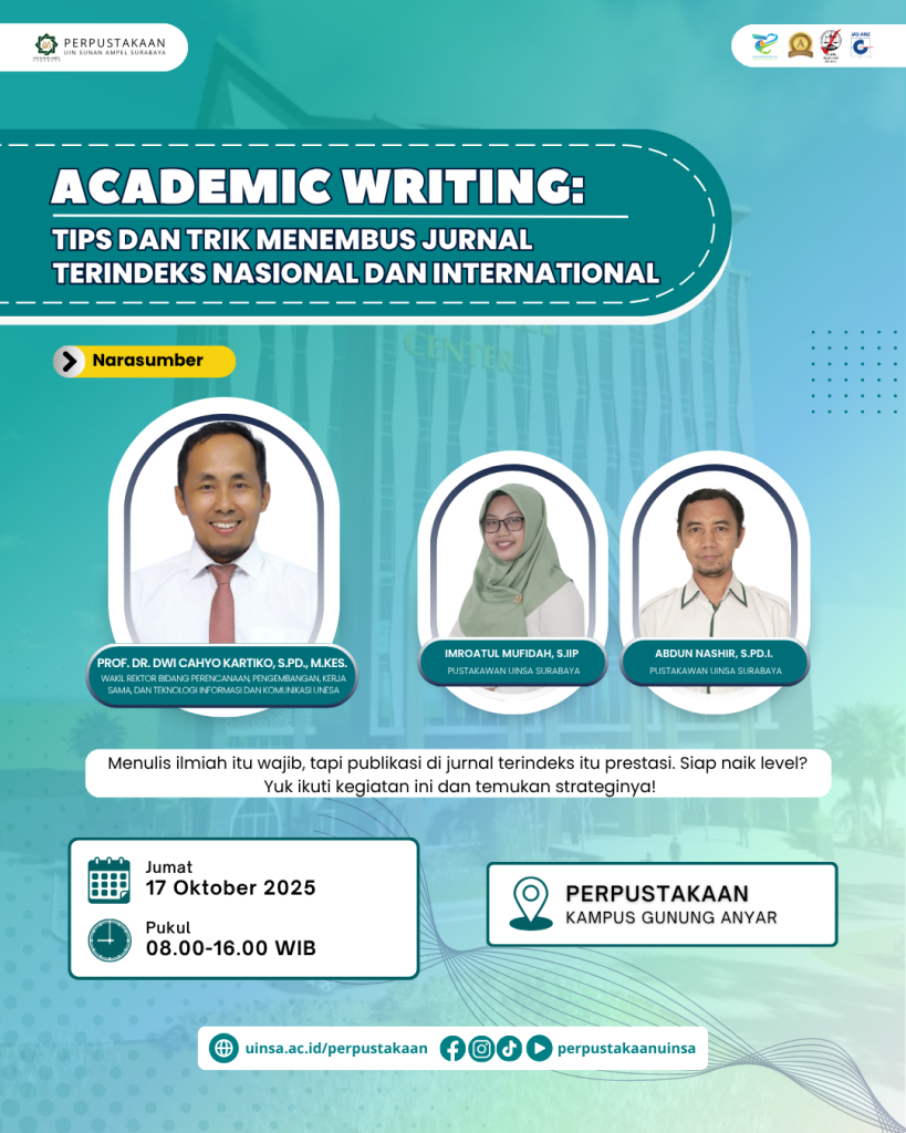 Perpustakaan UINSA akan menyelenggarakan Seminar Academic Writing bertema “Tips dan Trik Menembus Jurnal Terindeks Nasional dan Internasional.” Kegiatan ini menjadi bagian dari upaya perpustakaan dalam meningkatkan kompetensi sivitas akademika, khususnya dalam menghasilkan publikasi ilmiah yang berkualitas dan berdaya saing global.