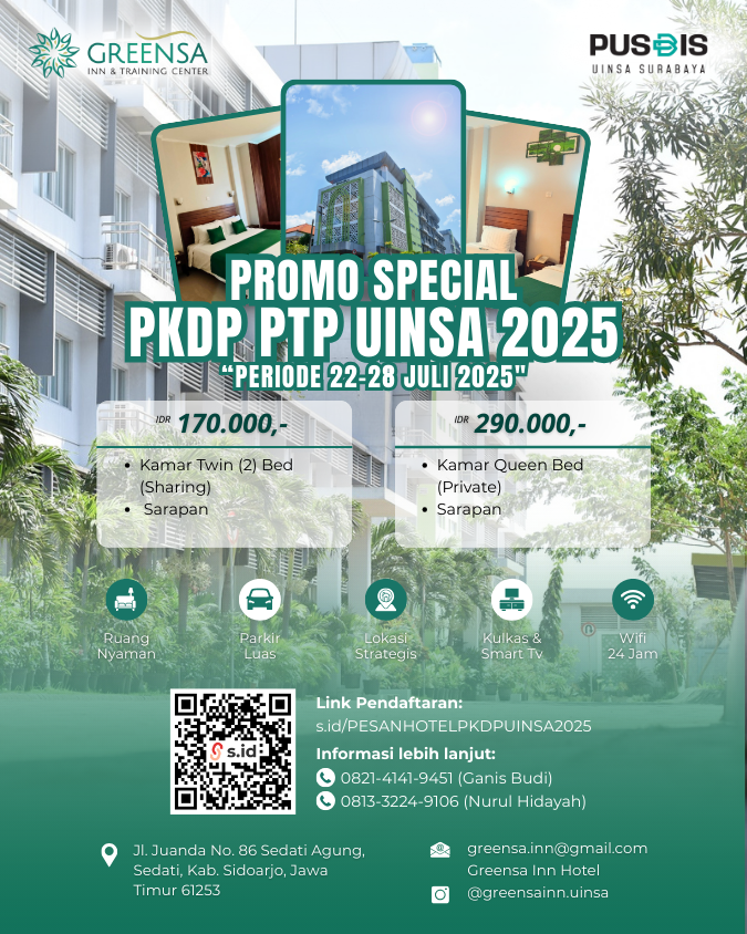 Cari penginapan nyaman, strategis, dan siap mendukung perjuangan kamu di PKDP UINSA?😎 GreenSA Inn & Training Center hadir dengan promo spesial “PKDP 2025”!!