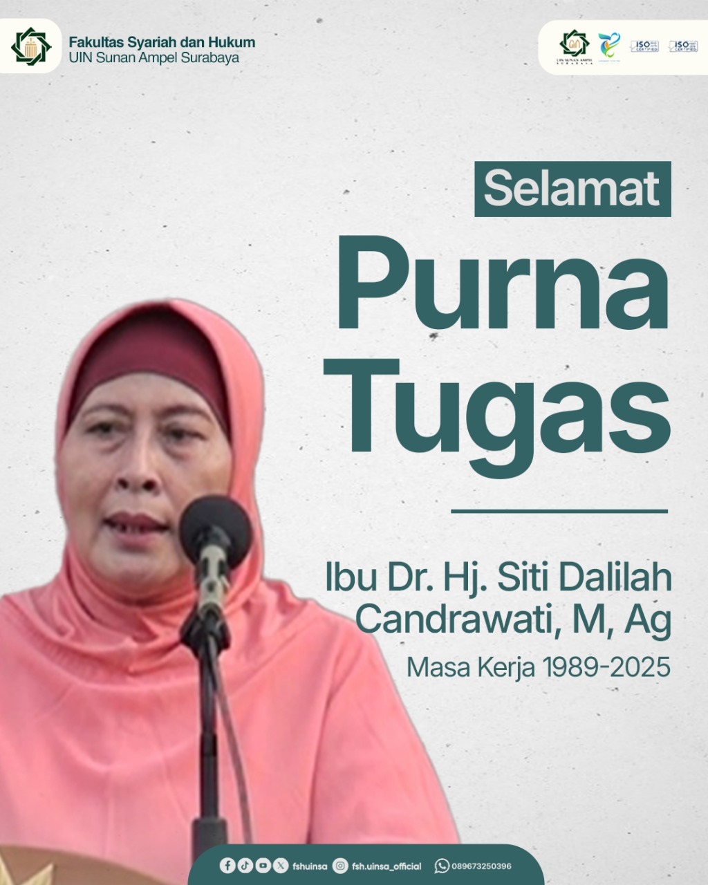 Seluruh keluarga besar Fakultas Syariah dan Hukum UIN Sunan Ampel Surabaya menyampaikan doa dan penghargaan yang setulus-tulusnya atas pengabdian Ibu Dra. Hj. Siti Dalilah Candrawati, M.Ag. selama lebih dari tiga dekade. Selamat menikmati masa purna tugas, Bu Dalilah. Terima kasih atas keteladanan, dedikasi, dan ketulusan yang telah Ibu curahkan. Jejak pengabdian Ibu akan selalu menjadi bagian tak terpisahkan dari sejarah, semangat, dan inspirasi perjalanan FSH UINSA.