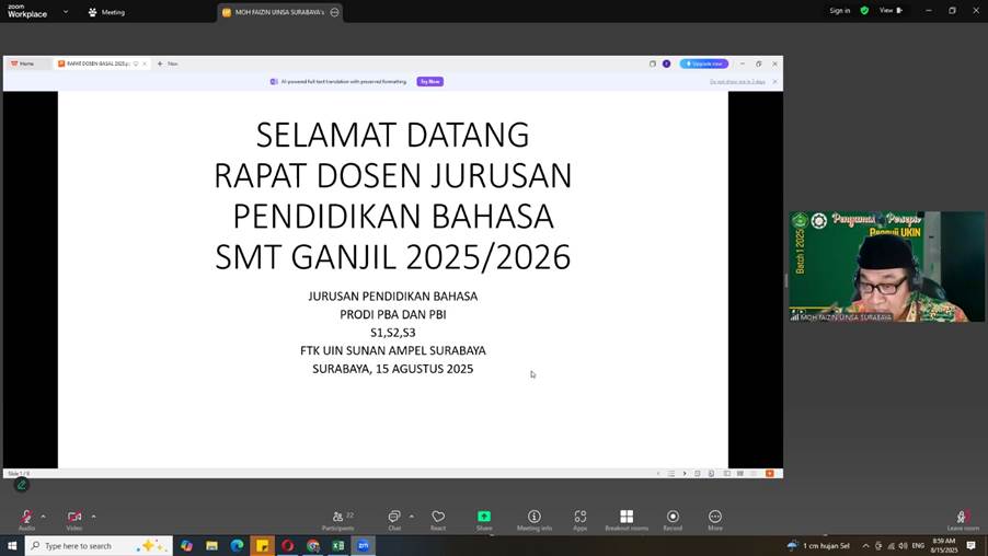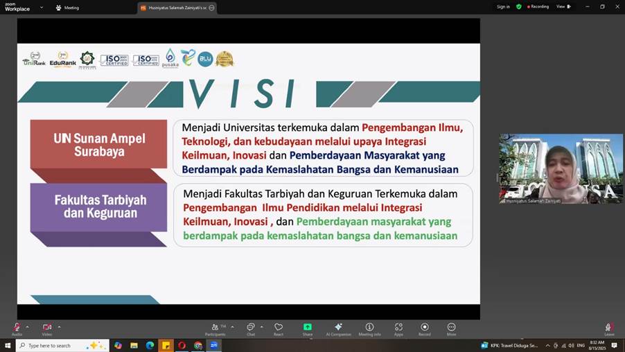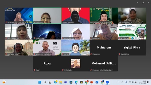 Pada tanggal 15 Agustus 2025 Fakultas Tarbiyah dan keguruan UINSA mengadakan rapat dosen secara online untuk mempersiapkan perkuliahan semester ganjil 2025/2026. Agenda ini dibuka ole dekan FTK Prof. Mohammad Thohir, M.Pd dengan memberikan semangat dan upgrade dosen serta update capaian-capaian FTK di semester lalu. Kemudian Acara dilanjutkan oleh wakil dekan 1 bidang akademik Prof. Dr. Hj. Husniyatus Salamah, M.Ag, beliau menyampaikan visi misi FTK, kurikulum OBE, peran dosen dalam pengajaran dan pembimbingan akademik, dan prodi-prodi yang akan reakreditasi termasuk Pendidikan Bahasa Inggris.
