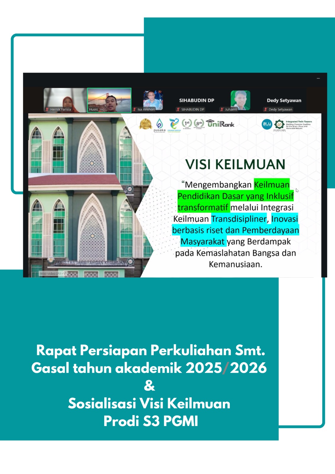 Surabaya, 15 Agustus 2025 – Program Studi Doktor Pendidikan Guru Madrasah Ibtidaiyah (PGMI), Universitas Islam Negeri (UIN) Sunan Ampel Surabaya menyelenggarakan sosialisasi visi keilmuan secara daring dan luring di kampus A. Yani pada hari Jum’at, 15 Agustus 2025. Acara yang dihadiri oleh dosen jurusan pendidikan dasar diawali dengan rapat persiapan perkuliahan semester gasal 2025/2025. Setelah agenda rapat selesai, dilanjutkan dengan kegiatan sosialisasi visi keilmuan prodi yang dihadiri oleh mahasiswa prodi doktor PGMI, praktisi pendidikan, dan stakeholder terkait. Kegiatan ini bertujuan untuk memperkenalkan arah pengembangan keilmuan yang inovatif dan berorientasi global, sekaligus mengajak masyarakat akademik berkontribusi dalam mewujudkan pendidikan dasar yang inklusif dan transformatif.