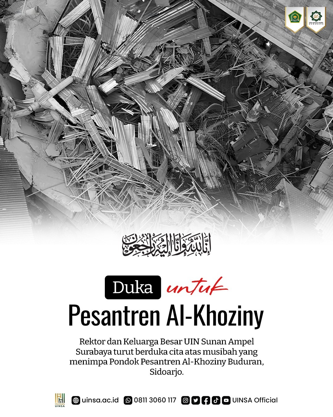 UINSA Newsroom, Selasa (30/09/2025); Kabar duka datang dari Pondok Pesantren (Ponpes) Al-Khoziny, Buduran, Sidoarjo, Jawa Timur. Sekitar pukul 15.00 WIB, Musala tiga lantai di area Ponpes tersebut ambruk pada Senin (29/9/2025) yang telah menimbulkan korban dari kalangan santri.