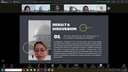 One of the most dynamic panel sessions was the one focusing on the sub theme “War and Conflict Prevention in a Multipolar World.” This crucial session was guided by Rania Nisrina Sholichah, who acted as moderator for five presenters who presented their research findings. The panel discussion highlighted a broad spectrum, ranging from the failure to enforce humanitarian law in war zones to the rise of civil society advocacy movements.