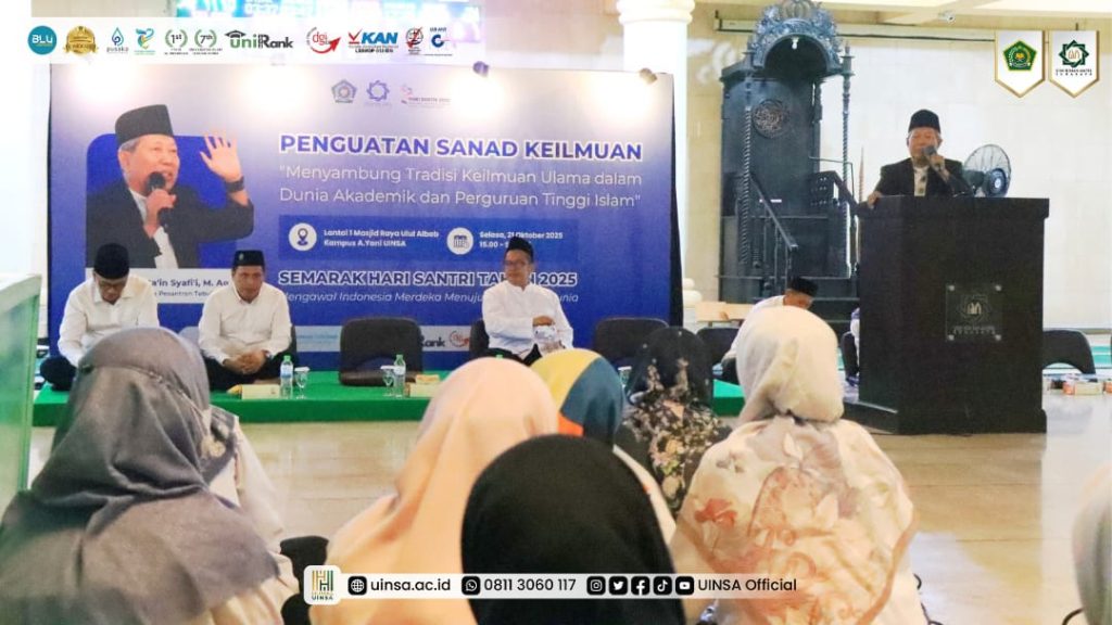 UINSA Newsroom, Selasa (21/10/2025); Selasa, 21 Oktober 2025, UIN Sunan Ampel (UINSA) Surabaya menggelar kegiatan pembinaan pegawai dalam rangka ‘Semarak Hari Santri Tahun 2025.’ Kegiatan yang digelar di Masjid Raya Ulul Albab ini menghadirkan narasumber Dr. KH. Musta’in Syafi’i, M.Ag., Pengasuh Pondok Pesantren Tebuireng Jombang.