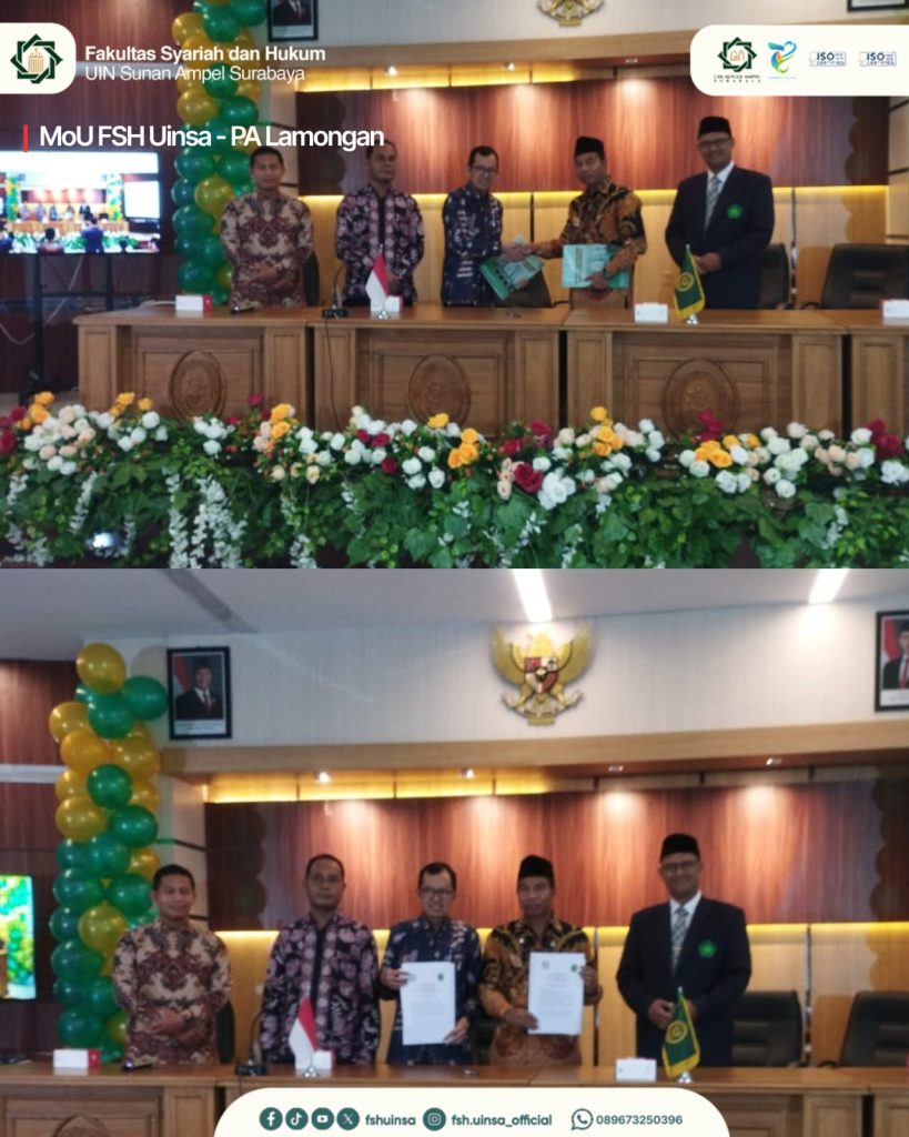 Penandatanganan MoU dilakukan oleh Dr. H. Muhammad Arif, Lc., M.A., selaku Wakil Dekan I yang mewakili pimpinan FSH UINSA, bersama Ketua PA Lamongan, H. Ridwan Fauzi, S.Ag., M.H. Acara ini turut dihadiri oleh jajaran hakim, panitera, dan pejabat struktural PA Lamongan, serta delegasi dari FSH UINSA yang terdiri atas dosen dan staf akademik. Penandatanganan ini menandai dimulainya kemitraan formal yang membuka berbagai peluang kolaborasi akademik dan profesional antarlembaga.