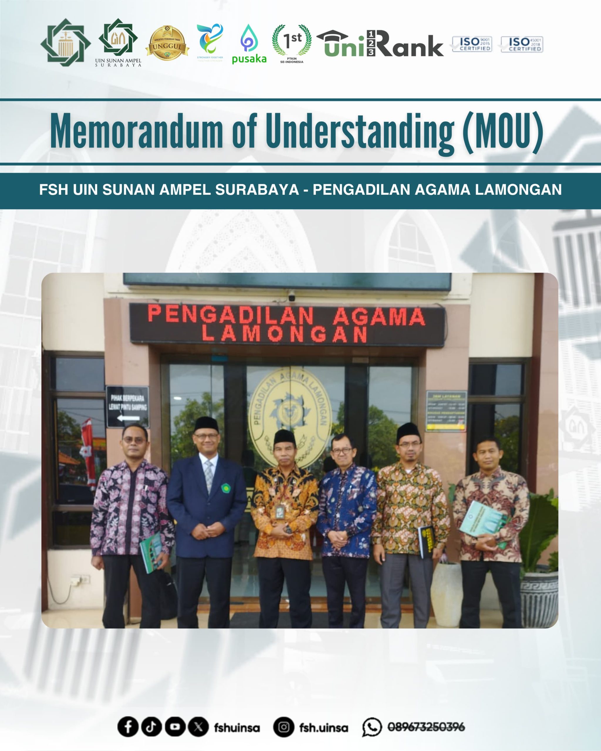 Lamongan, 1 Agustus 2025 – Dalam rangka memperkuat integrasi antara dunia akademik dan praktik peradilan, Fakultas Syariah dan Hukum (FSH) UIN Sunan Ampel Surabaya menjalin kerja sama kelembagaan dengan Pengadilan Agama (PA) Lamongan melalui penandatanganan nota kesepahaman (MoU). Kegiatan ini dilaksanakan pada Jumat, 1 Agustus 2025, bertempat di Kantor Pengadilan Agama Lamongan, dan menjadi bagian dari langkah strategis untuk meningkatkan kualitas pendidikan hukum Islam yang aplikatif, partisipatif, dan kontekstual.