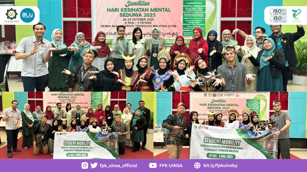 Malaysia – (28-29/10/2025) Fakultas Psikologi dan Kesehatan Universitas Islam Negeri Sunan Ampel Surabaya (FPK UINSA) turut memeriahkan kegiatan Hari Kesihatan Mental Sedunia 2025 yang diselenggarakan oleh Universiti Teknologi Malaysia (UTM). Kegiatan ini menjadi bagian dari program Student Mobility yang bertujuan mempererat kerja sama akademik antar universitas sekaligus merayakan Hari Kesehatan Mental Sedunia.