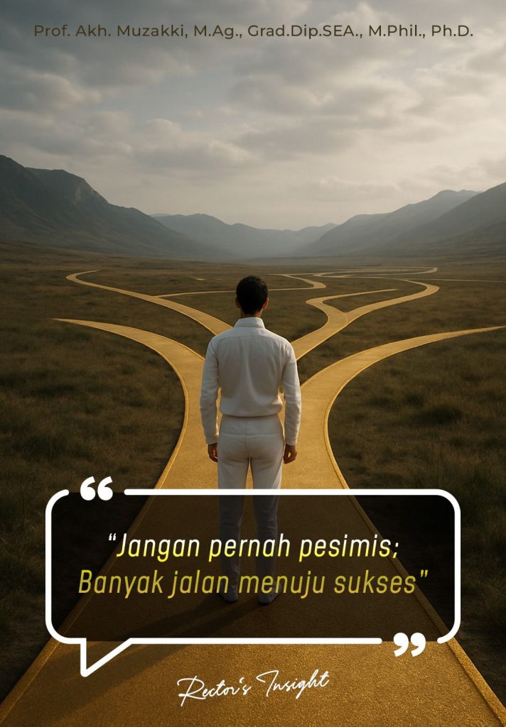 Jangan pernah pesimis menyambut masa depan. Itu rumus penting yang harus dijaidkan sebagai pelajaran. Sebab, apapun kondisi yang dihadapi, sukses itu bisa dilakukan dengan berbagai macam cara. Ada banyak cara menuju sukses. Karena itu, kondisi apapun yang ada dalam diri dan lingkungan keluarga kita, jangan pernah pesimis. Tetaplah tegak menatap dan sekaligus menjemput masa depan. Setiap peserta didik, termasuk mahasiswa, penting memegangi kuat-kuat rumus ini. Sebab, sukses itu memiliki lahannya sendiri. Juga, sukses itu memiliki zamannya sendiri. Maka, apapun kondisi diri dan lingkungan, jangan pernah lupa bahwa sukses itu akan memiliki konteks perwujudannya masing-masing.