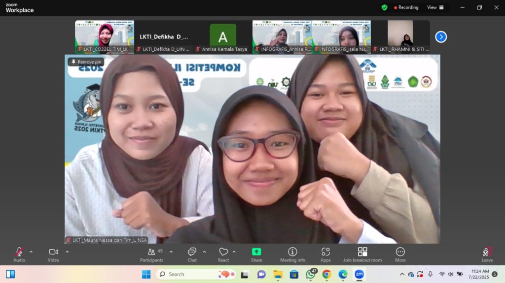 [Surabaya, 25 Juli 2025] — Prestasi membanggakan kembali ditorehkan oleh mahasiswa Program Studi Ilmu Kelautan Fakultas Sains dan Teknologi (FST) UIN Sunan Ampel Surabaya. Tim yang terdiri dari Maura Nessa Indardini, Khoirun Nadhifah, dan Hawa Neza Pratiwi berhasil meraih Juara 1 dalam ajang Lomba Karya Tulis Ilmiah (LKTI) – Kompetisi Ilmiah PTKIN 2025 yang diselenggarakan oleh FST UIN Raden Fatah Palembang bekerja sama dengan Forum Dekan FST PTKIN se-Indonesia.