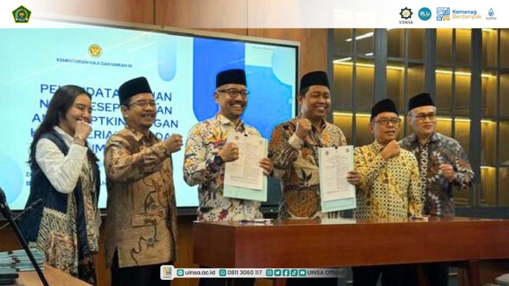 UINSA Newsroom, Rabu (12/11/2025); Rektor UIN Sunan Ampel (UINSA) Surabaya, menjadi satu dari 20 Rektor Perguruan Tinggi Keagamaan Islam Negeri (PTKIN) yang resmi menandatangani Nota kesepahaman/MoU dengan Kementerian Haji dan Umrah pada Selasa, 11 November 2025. Penandatanganan MoU ini dalam rangka memperbarui MoU tentang penyelenggaraan sertifikasi pembimbing Haji yang sebelumnya dilakukan dengan Kementerian Agama RI.