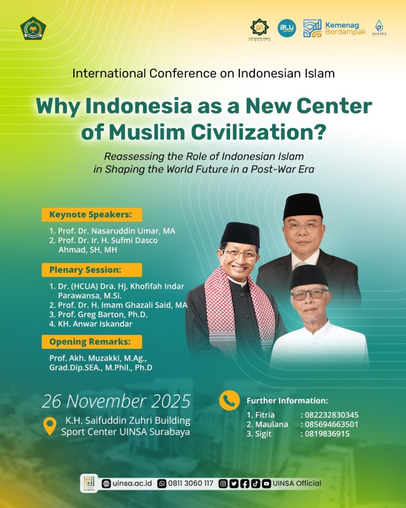 Dalam menghadapi dinamika global yang terus dipengaruhi oleh konflik geopolitik dan krisis kemanusiaan, UIN Sunan Ampel Surabaya akan menjadi tuan rumah konferensi internasional bergengsi bertajuk International Conference on Indonesian Islam: Why Indonesia as a New Center of Muslim Civilization? Reassessing the Role of Indonesian Islam in Shaping the World Future in a Post-War Era pada 26 November 2025 di Sport Center, UIN Sunan Ampel Surabaya.
