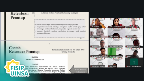 Kegiatan pelatihan yang padat dan intensif ini ditutup secara resmi oleh Dekan FISIP UINSA Surabaya, Prof. Dr. Abdul Chalik, M.Ag. Dalam sambutan penutupnya, Prof. Abdul Chalik menyampaikan rasa terima kasih yang mendalam kepada dua penyelenggara yang telah berkolaborasi dalam menyukseskan acara ini, yaitu Justitia Training Center dan Airlangga Center for Legal Drafting & Professional Development.